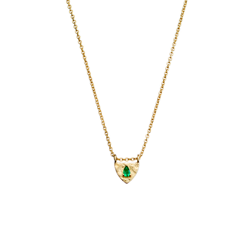 The Emerald Shield pendant is a fun blend of style and strength. Its bright emerald in a shield shape adds a splash of color, making it a playful symbol of courage to wear anywhere.