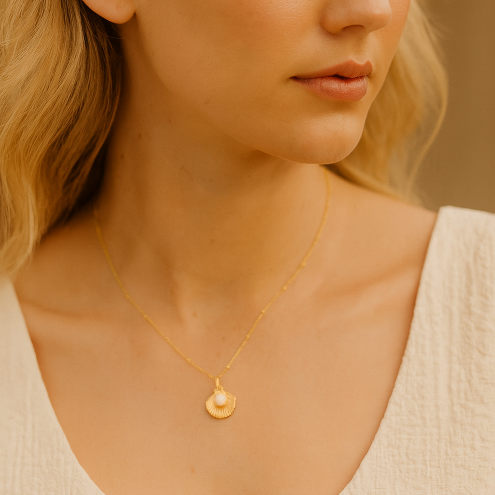 The Ocean Shell necklace features a dainty shell, shiny freshwater pearl, and golden beads that sparkle like sunlight on the waves. It’s a fun way to add a beachy touch to any outfit.